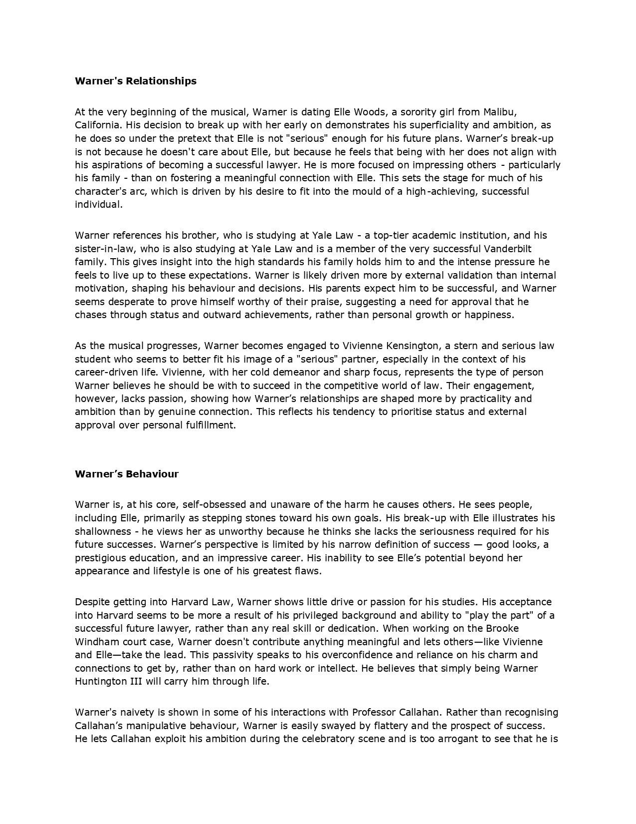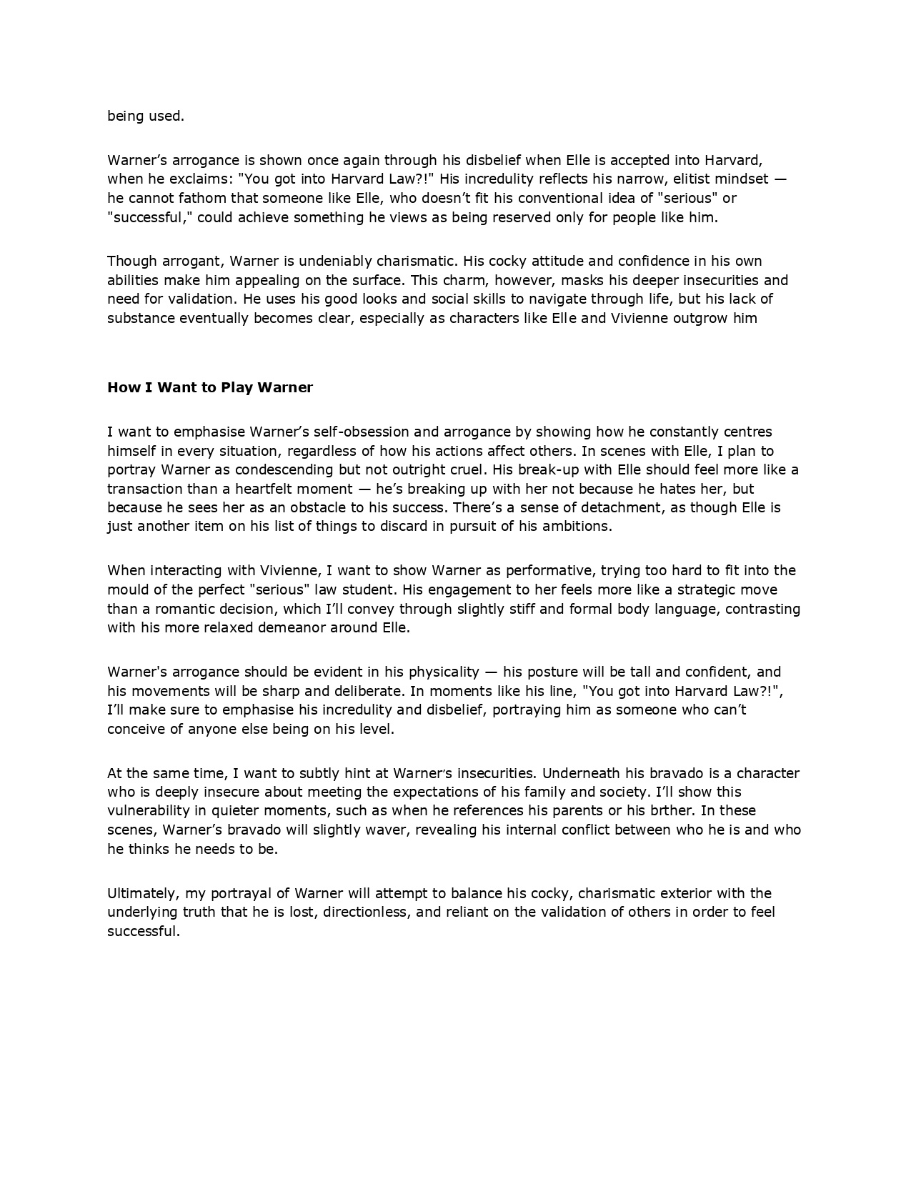 When preparing to portray Warner, I conducted an in-depth character analysis to ensure a thorough understanding of his personality traits, relationships, and motivations. This analysis allowed me to grasp not only his external behaviours, but also his internal conflicts, ambitions, and insecurities, which informed my performance. To make Warner feel authentic and distinctive, I came up with and incorporated idiosyncrasies such as obsessive self-grooming (adjusting his hair or straightening his clothing compulsively), as well as a signature smirk, which conveyed his arrogance and sense of superiority. These subtle physical habits reinforced his personality and made him more recognisable to the audience.